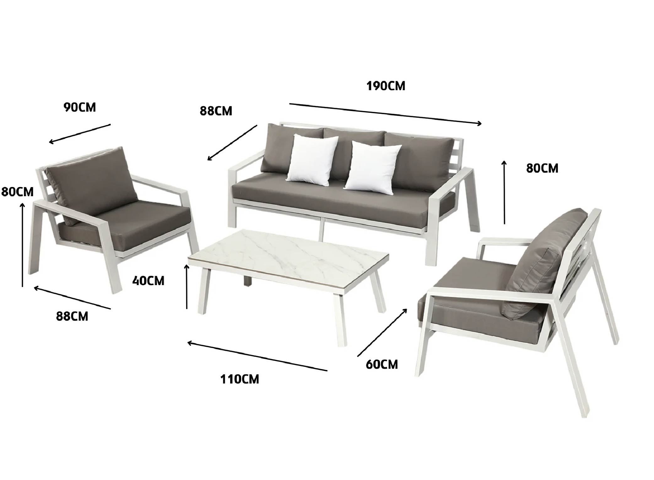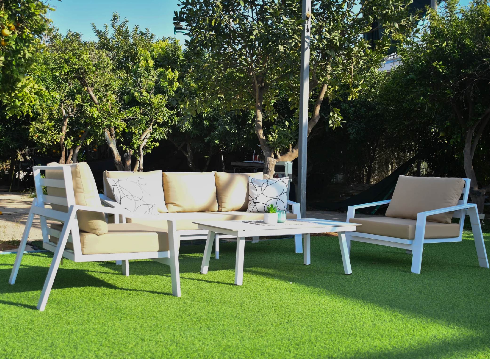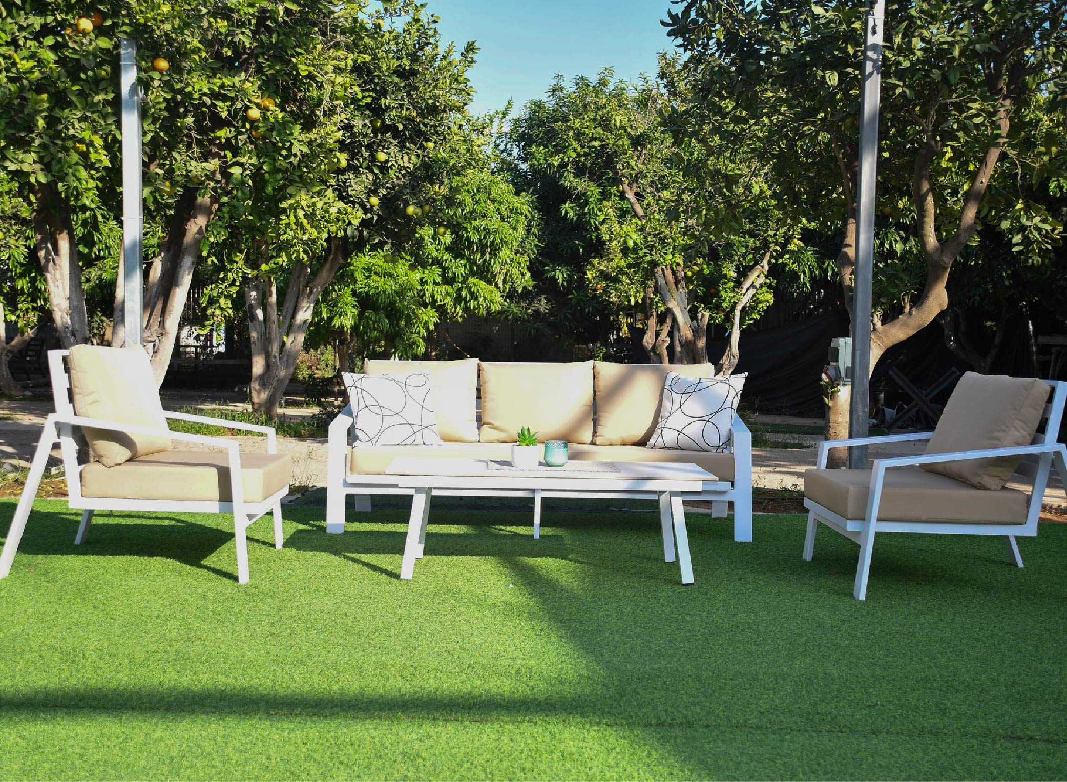 כולל: פינת ישיבה קלאסית דגם ניו יורק – ספה תלת מושבית, 2 ספות יחיד, שולחן אלומיניום בחיפוי שיש.
