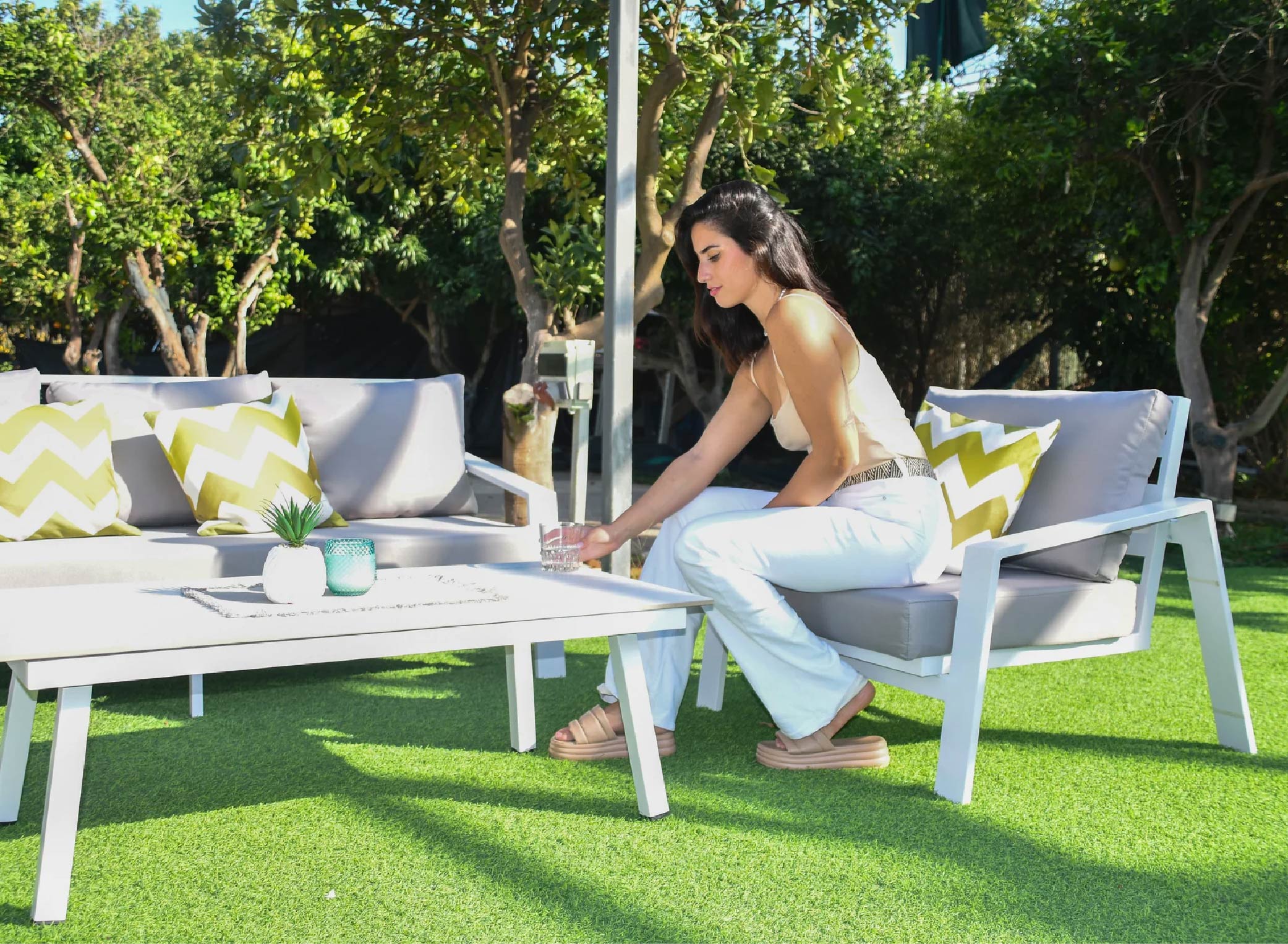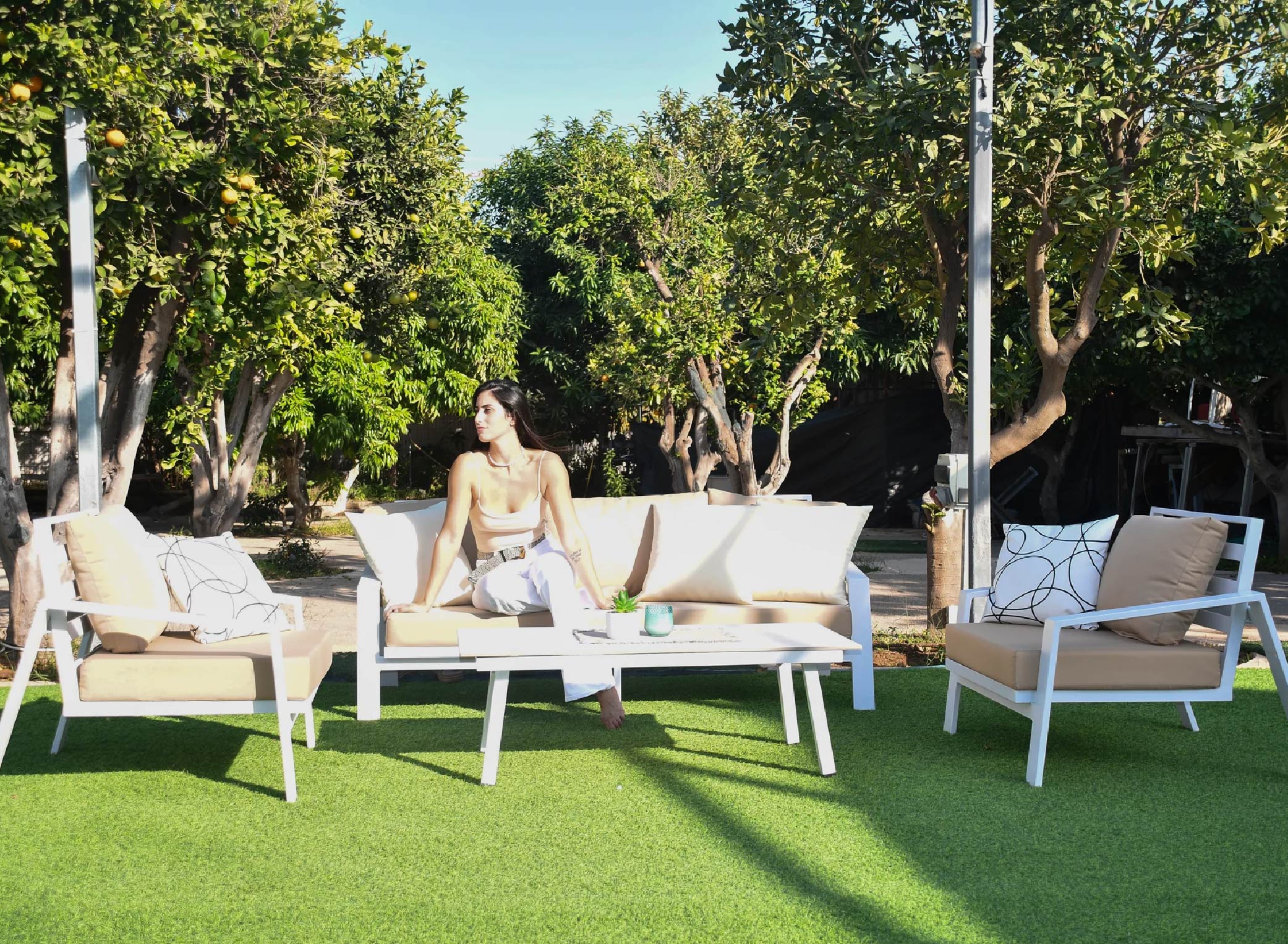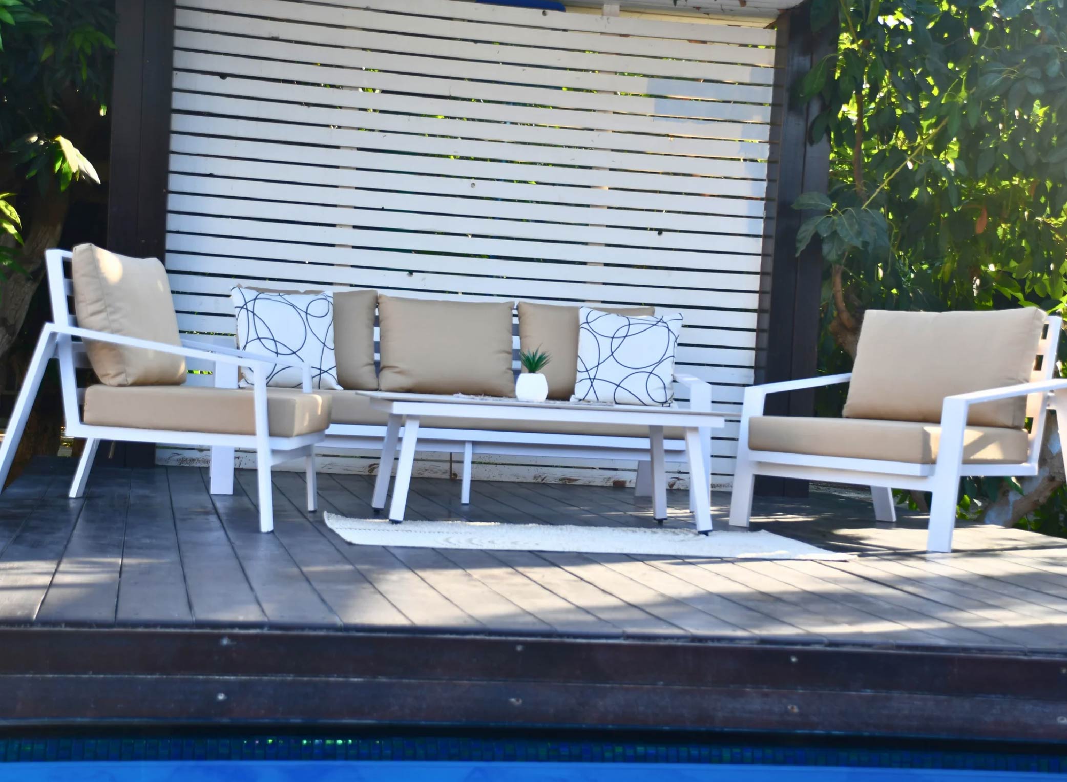 כולל: פינת ישיבה קלאסית דגם ניו יורק – ספה תלת מושבית, 2 ספות יחיד, שולחן אלומיניום בחיפוי שיש.