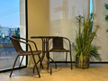 פינת הקפה לגינה כוללת שולחן מתכת בקוטר 60 ס"מ בשילוב זכוכית מחוסמת עגולה בצבע שחור יחד עם 2 כסאות מתכת יציבים בעיצוב קש קלוע.
